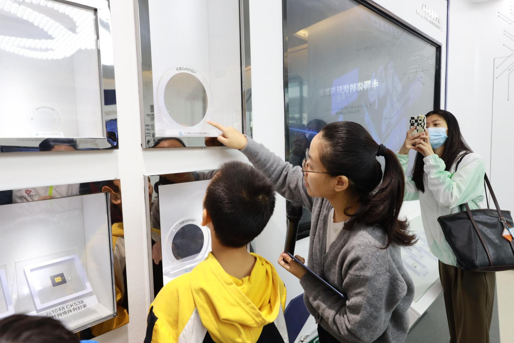 首先,科普第一站来到广州第三代半导体创新中心展厅,周瑾老师根据青少年的理解和接受能力,“按需订单”为青少年量身定制半导体知识科普套餐。在周瑾老师的带领下,通过围绕“什么是半导体”“为什么发展第三代半导体”以及“第三代半导体的应用”为同学们介绍第三代半导体的发展现状,用生动有趣的方式耐心细致地讲解了什么是硅、晶圆制造的流程和工艺以及第三代半导体芯片在高科技领域的广泛应用,并通过沉浸式BOX幕,感受沉浸式科学盛宴。针对同学们的提问,周瑾老师耐心的解答充分满足了大家的好奇“芯”。