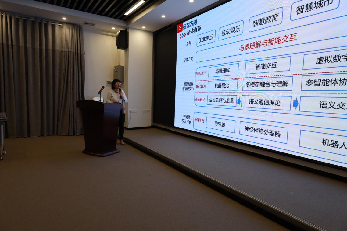 谢雪梅教授主要介绍了学院人工智能方向的研究成果,实验室依托广州市场景理解与智能交互重点实验室,以场景理解与智能交互为核心,开展人体姿态估计和人物交互、虚拟数字人、机器视觉、仿生动态相机、高精度传感器等基础理论、算法和应用相关研究,关键成果可用于工业制造过程操作行为监督与分析、体育运动教学、面向个性化教学的虚拟课堂、高速动态事件成像、机器人服务、智能交通等。